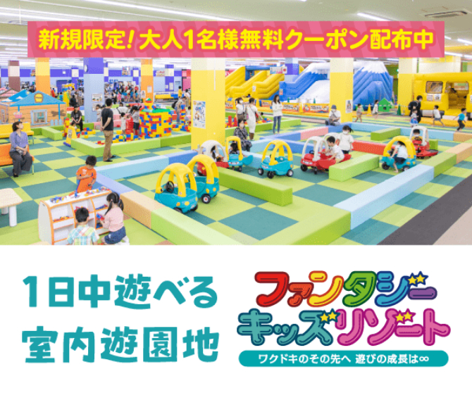ファンタジーキッズリゾートは、日本最大級の室内遊園地チェーン。雨の日でも夏の猛暑日でも快適に子どもと遊べる全天候型の施設で、対象は0歳〜12歳までの子どもとその家族です。