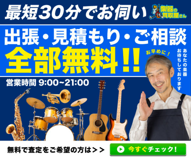 最短30分で無料の出張査定に対応し、ギターやベース、ドラム、管楽器、電子ピアノ、DJ機材まで幅広く高額買取を行っています。